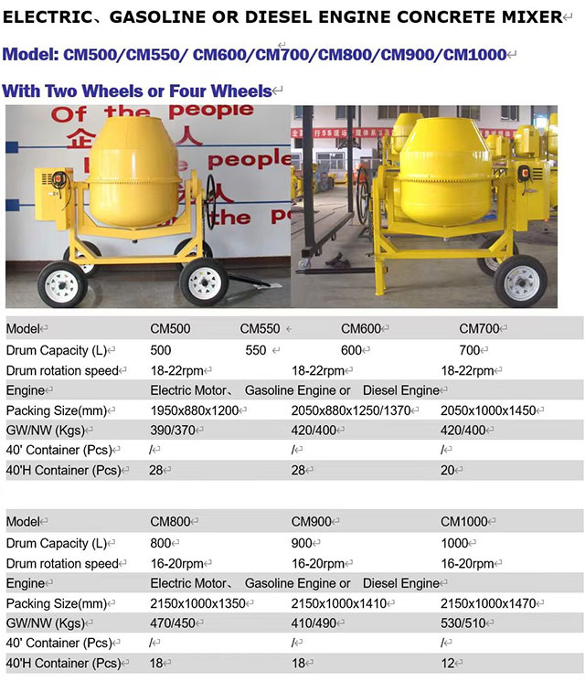 မတူညီသောပရောဂျက်စကေးများအတွက်၊ ZCJK Concrete Mixer သည် မော်ဒယ်အမျိုးမျိုးကို ပံ့ပိုးပေးသည်- သေးငယ်သော 200L မော်ဒယ်သည် ကျေးလက်တွင် ကိုယ်တိုင်တည်ဆောက်ထားသော အိမ်များ၊ အိမ်ဝင်းများ မာကျောခြင်းနှင့် အခြားအခြေအနေများ၊ ပြောင်းလွယ်ပြင်လွယ်နှင့် မိုဘိုင်းအတွက် သင့်လျော်ပါသည်။ အလတ်စား 500 မော်ဒယ်သည် မြူနီစီပယ်လမ်း ပြုပြင်ထိန်းသိမ်းရေး၊ ရပ်ရွာတည်ဆောက်ရေးနှင့် အခြားပရောဂျက်များအတွက် သင့်လျော်ပြီး၊ ကြီးမားသော 1000L မော်ဒယ်သည် အကြီးစားပရောဂျက်များအတွက် သင့်လျော်ပြီး ကြီးမားသော စက်ရုံတည်ဆောက်မှုနှင့် တံတားတည်ဆောက်မှုတို့ကြောင့် ထုတ်လုပ်မှုမြင့်မားသော လိုအပ်ချက်များကို ရောစပ်ပေးပါသည်။ ထို့အပြင်၊ ၎င်းသည် "ဝယ်လိုအား၊ မြင်ကွင်းနှင့်လိုက်လျောညီထွေဖြစ်မှု" ကို အမှန်တကယ်ရရှိစေရန်အတွက် ဒရမ်စွမ်းရည်၊ မော်တာပါဝါ၊ ထုတ်လွှတ်သည့်မုဒ်နှင့် အခြားအထူးလိုအပ်ချက်များကို ရောစပ်ထားသည့် စိတ်ကြိုက်ပြင်ဆင်မှုကို ပံ့ပိုးပေးပါသည်။